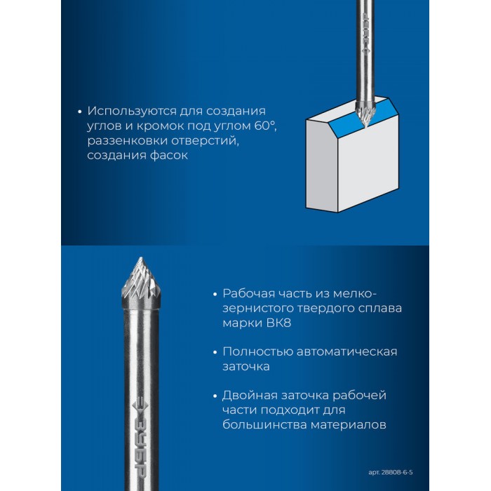 Борфреза твердосплавная 6?5 мм тип J зенкер с вершиной 60° хв-к 6 мм Профессионал ЗУБР 28808-6-5