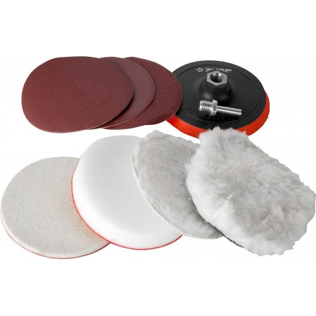 Набор применяется при проведении полировально-шлифоваьных работ по дереву, металлу и лакокрасочным покрытиям c использованием дрели или УШМ.