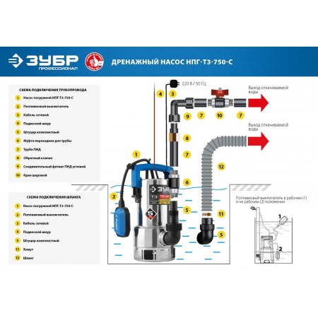 - Поплавковый выключатель обеспечивает автоматическое вкл/выкл при изменении уровня воды