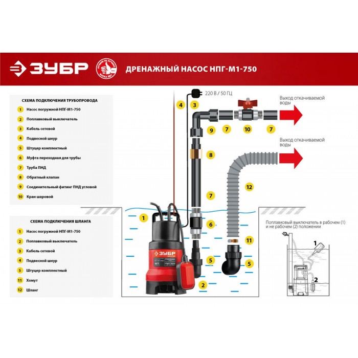 - Поплавковый выключатель обеспечивает автоматическое вкл/выкл при изменении уровня воды