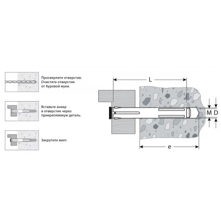 Для крепления оконных рам и дверных коробок к полнотелым основаниям: поверхностям из бетона, полнотелого кирпича или природного камня. Анкер устанавливается в предварительно просверленное и очищенное от буровой муки отверстие, расклинивание происходит при закручивании винта. Минимальная глубина анкеровки - 30мм. Минимальная глубина сверления (е) - 50мм. Для установки анкера требуется бита PZ3.