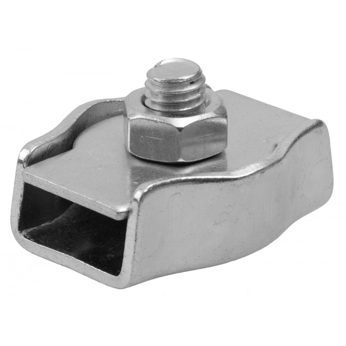 Для формирования петель на концах троса. Используются на тросах без оплетки ПВХ (если трос имеет оплетку, ее необходимо снять перед установкой зажима). Свободный конец троса закладывается в зажим (конец троса должен выходить из зажима на расстояние не менее 1/2 диаметра троса). Далее в петлю троса закладывается коуш, после которого трос помещается в зажим с другой стороны винта. Сверху помещается прижимная пластина, которую небходимо крепко зафиксировать с помощью гайки. Свободный конец троса рекомендуется обмотать изолентой для предотвращения разматывания троса после установки. Перед использованием необходимо убедиться, что гайки на зажимах закручены полностью.