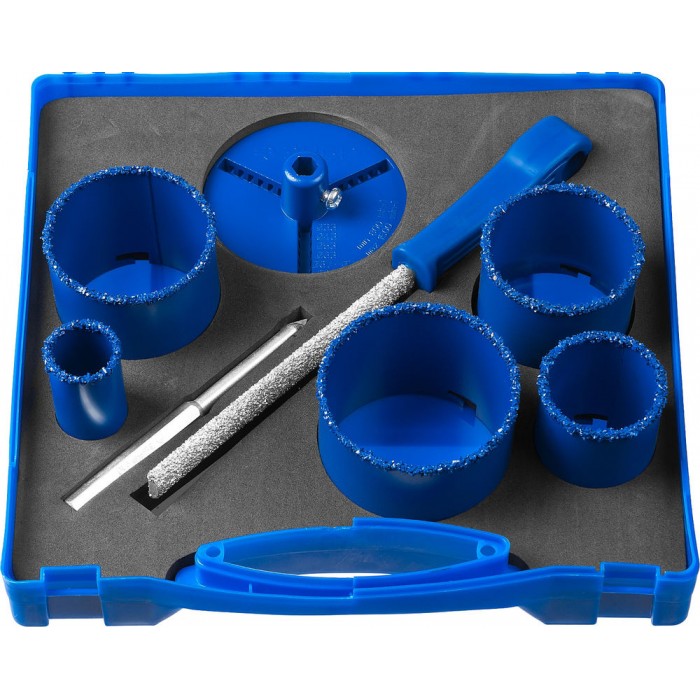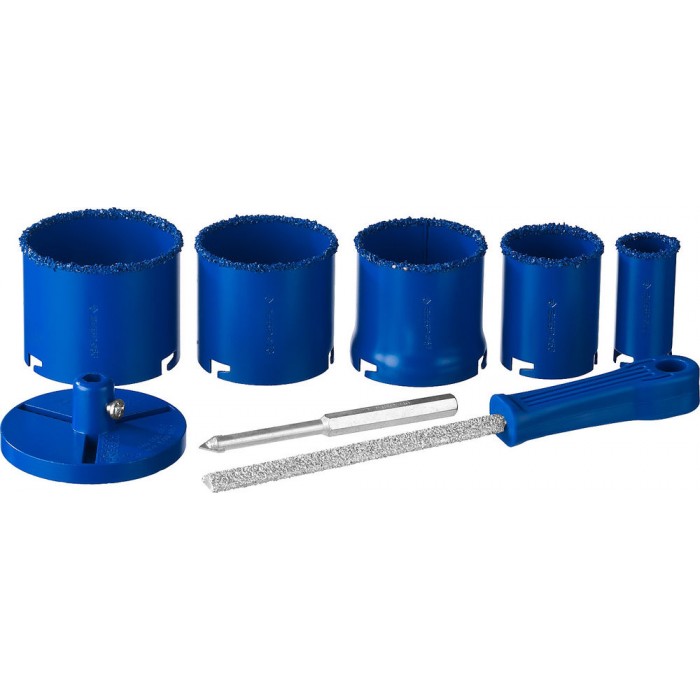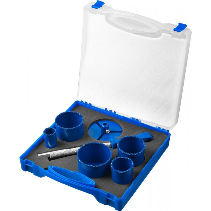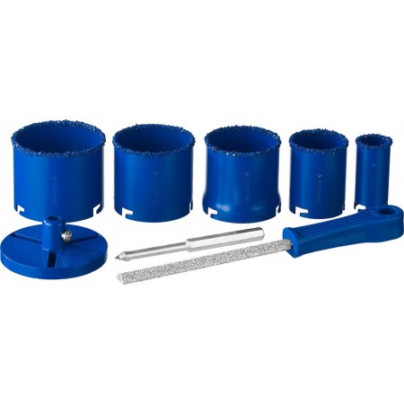 Набор применяется для получения ровных отверстий в облицовочных материалах, а также в ячеистом бетоне, кирпиче и гипсокартоне. Используется на дрелях и легких перфораторах в режиме безударного сверления.