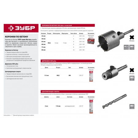 Коронки по бетону используются совместно с державками и центрирующими сверлами. Широкий ассортимент оснастки ЗУБР позволяет реализовать самые сложные задачи в работе по бетону, камню и кирпичу.