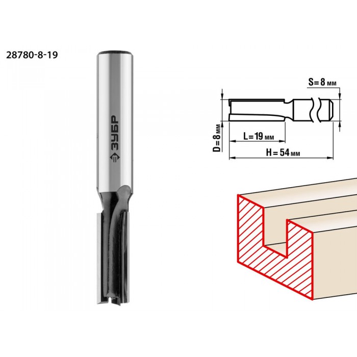 Фреза пазовая прямая 8 x 19 мм, хвостовик 8 мм ЗУБР Профессионал 28780-8-19