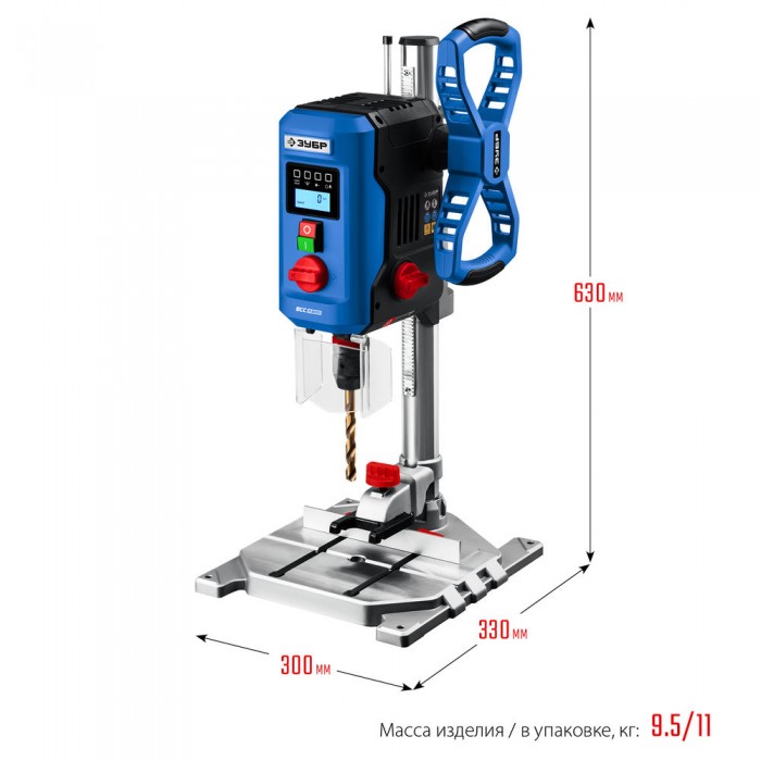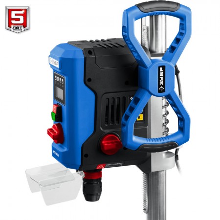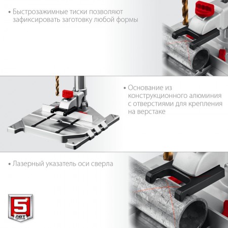 Профессиональный сверлильный станок для точных работ. Быстрое и качественное сверление отверстий в различных материалах (при установке соответствующих типов сверл). Электронный дисплей позволяет считывать информацию о текущей скорости и глубине сверления во время эксплуатации. Быстрозажимное устройство позволяет нажёжно фиксировать даже круглые заготовки, обеспечивая высокую точность выполняемых отверстий. Лазерный указатель точно указывает точку вхождения сверла в материал, обеспечивая быстрое получение точного результата. LED подсветка рабочей зоны. Двухступенчатый редуктор позволяет подобрать оптимальные режимы для обрабатываемого материала