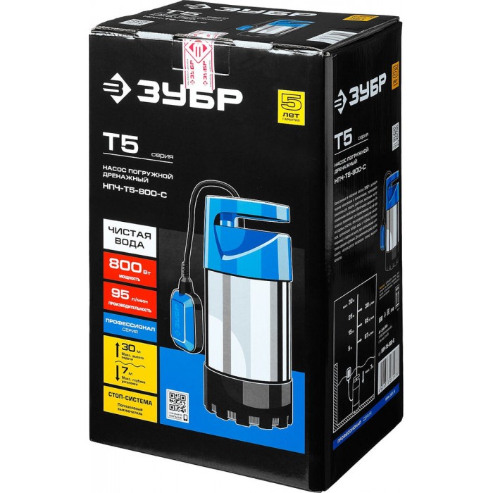 Насос дренажный с большим напором 800 Вт, корпус из нержавеющей стали ЗУБР Профессионал НПЧ-Т5-800-С