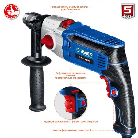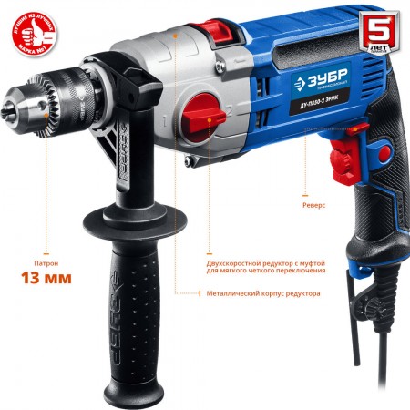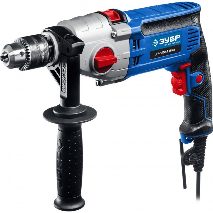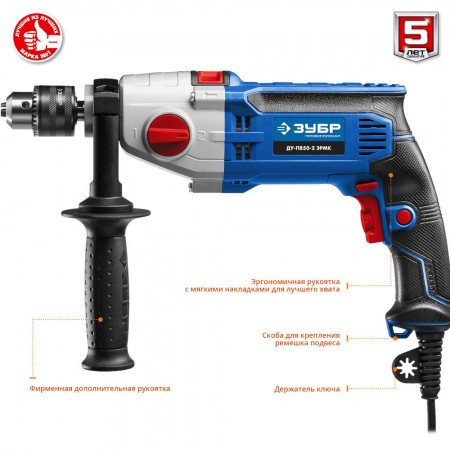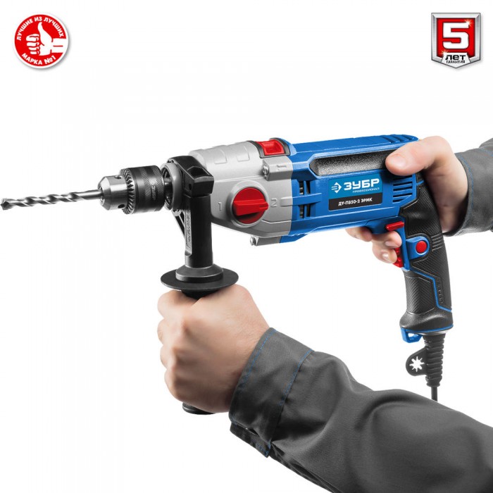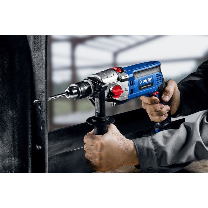 - Надежное удержание дрели благодаря обрезиненной основной и удобной дополнительной рукояткам