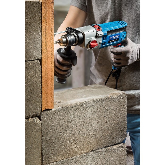 - Функция сверления с ударом позволяет выполнять отверстия в кирпиче и легком бетоне