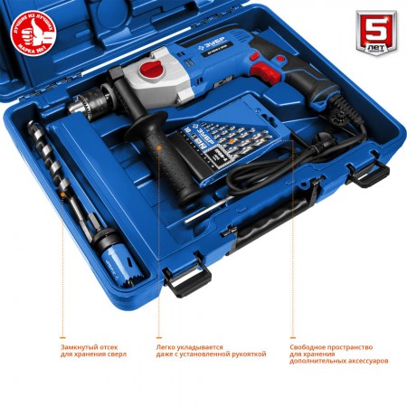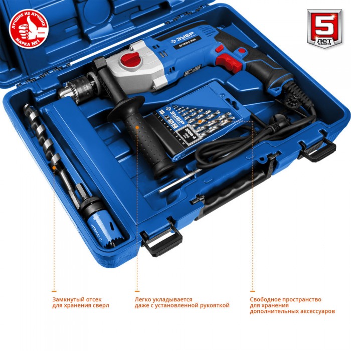 Универсальный инструмент для сверления отверстий в различных материалах (дерево, сталь и т. д.). Благодаря микроудару подходит для алмазного сверления. Профессиональная дрель с мощным двигателем, надежным ударным механизмом, продуманной эргономикой и вместительным кейсом