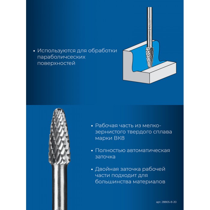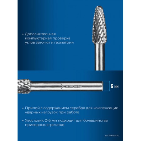Борфреза твердосплавная 8?20 мм тип F парабола с закругленным углом радиус 2.0 мм хв-к 6 мм Профессионал ЗУБР 28805-8-20