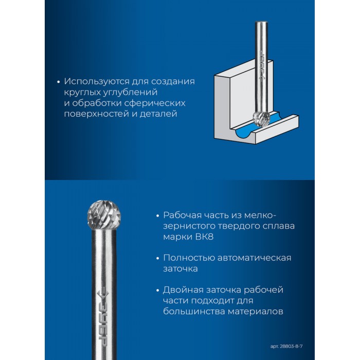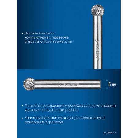Борфреза твердосплавная 8?7 мм тип D сфера хв-к 6 мм Профессионал ЗУБР 28803-8-7