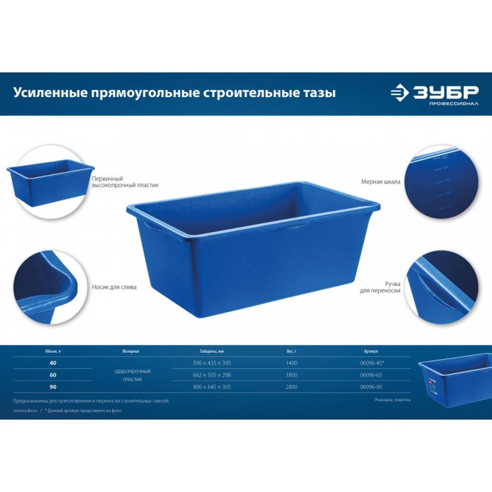 Таз строительный прямоугольный 90 л, первичный высокопрочный пластик, усиленный ЗУБР 06096-90