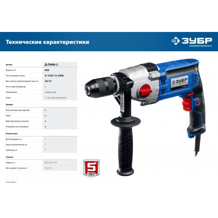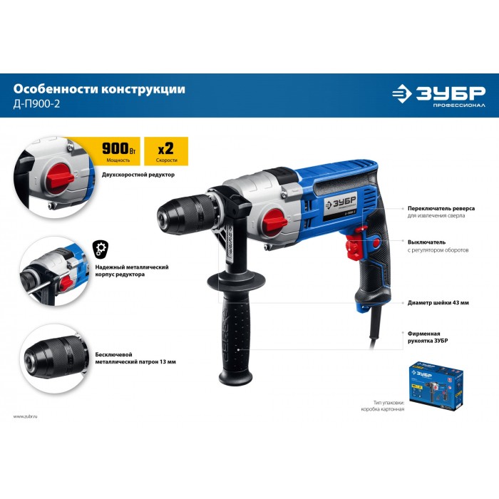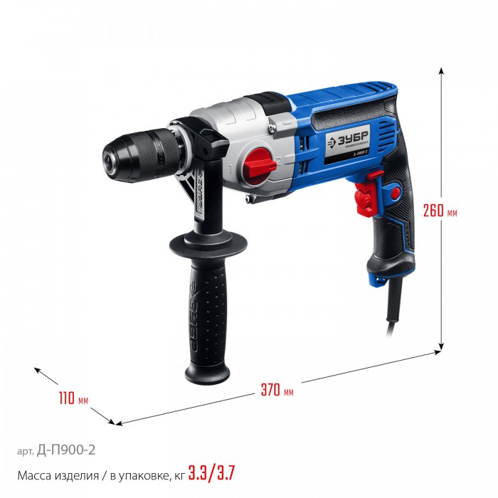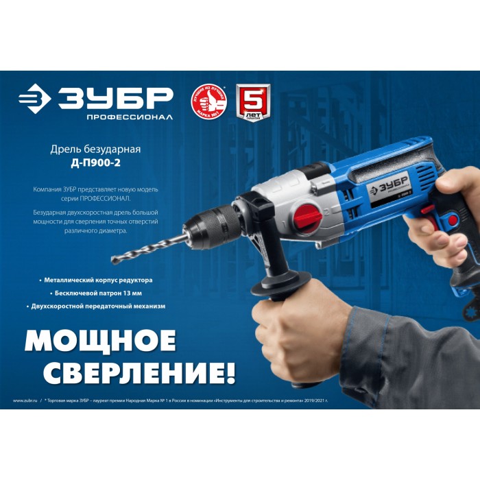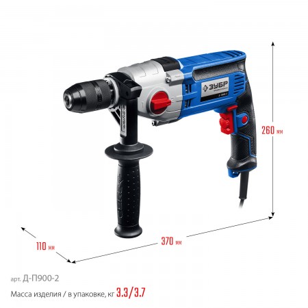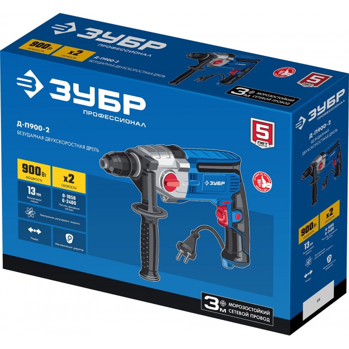 ЗУБР 900 Вт, 13 мм, безударная дрель, 2-скоростная, мет. корпус, Профессионал (Д-П900-2)