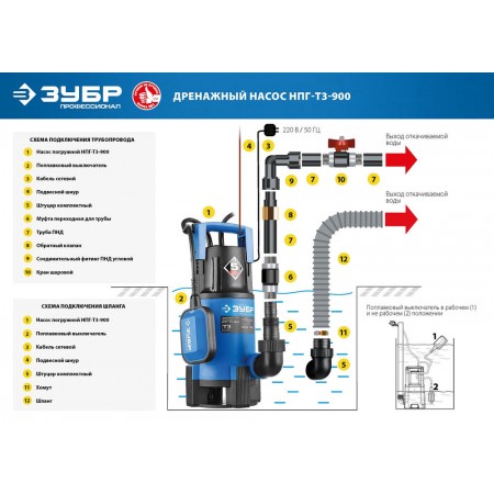 - Поплавковый выключатель обеспечивает автоматическое вкл/выкл при изменении уровня воды