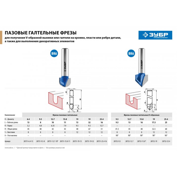 Фреза пазовая галтельная V-образная 9.5 x 9.5 мм, угол 90° ЗУБР Профессионал 28752-9.5