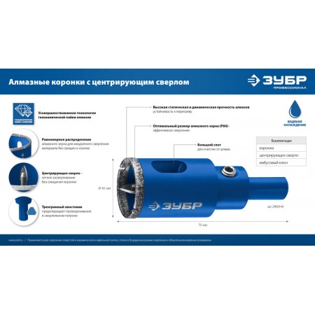 Для сверления отверстий в керамической и кафельной плитке, стекле, при обязательном водяном охлаждении. Используется с дрелями и шуруповертами в режиме безударного сверления.