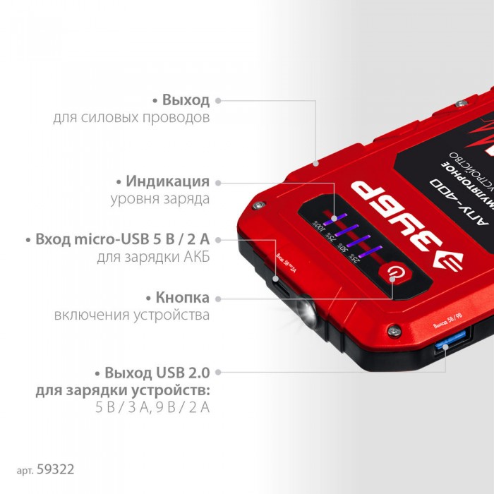 Специальное пуско-зарядное устройство с литий-полимерными аккумуляторами, для аварийного запуска двигателя транспортного средства в случае неисправной АКБ. Устройство подходит для любых типов транспортных средств с напряжением бортовой сети 12В, а также служит для подзарядки и работы широкого ряда мобильной техники и электроники от встроенных разъемов USB 5В. Рекомендовано для любых типов транспортных средств бензиновыми двигателями до 2500 см. куб.