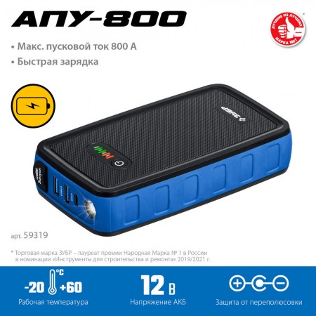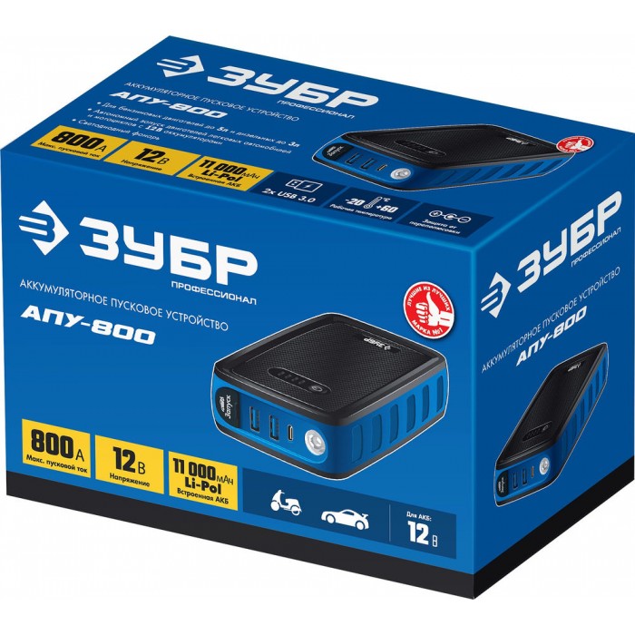 Специальное пуско-зарядное устройство с литий-полимерными аккумуляторами, для аварийного запуска двигателя транспортного средства в случае неисправной АКБ. Устройство подходит для любых типов транспортных средств с напряжением бортовой сети 12В, а также служит для подзарядки и работы широкого ряда мобильной техники и электроники от встроенных разъемов USB 5В. Рекомендовано для любых типов транспортных средств бензиновыми двигателями до 5000 см. куб. и дизельными до 3000 см. куб.