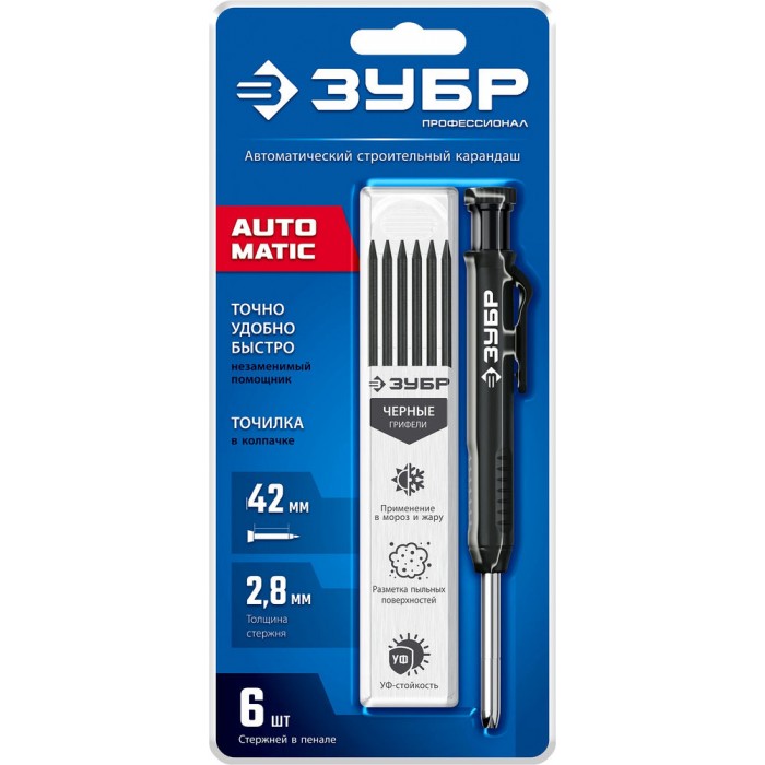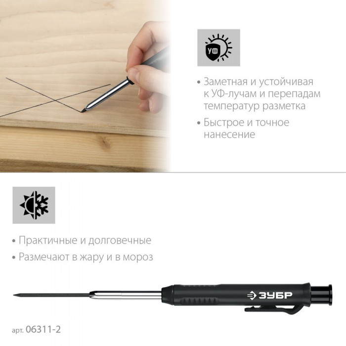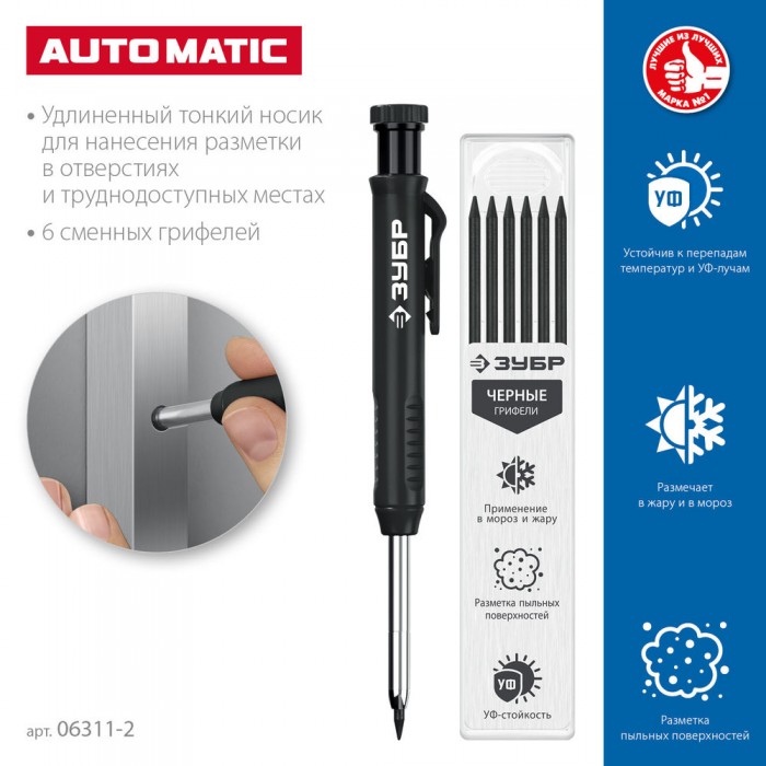 Автоматический строительный карандаш подходит для нанесения разметки на большинство материалов. Не выгорает на солнце, устойчив к температурным перепадам. Безопасен для человека и окружающей среды, т.к. не содержит токсических веществ.