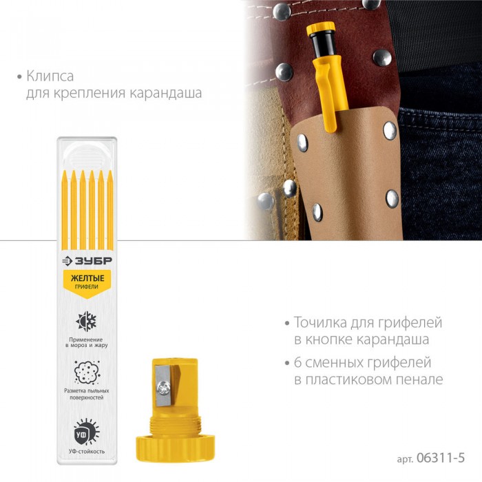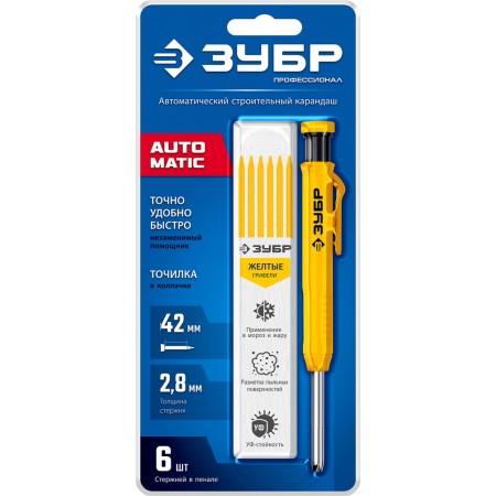 Карандаш автоматический d 2,8 мм, HB, 6 сменных грифелей ЗУБР АСК жёлтый 06311-5
