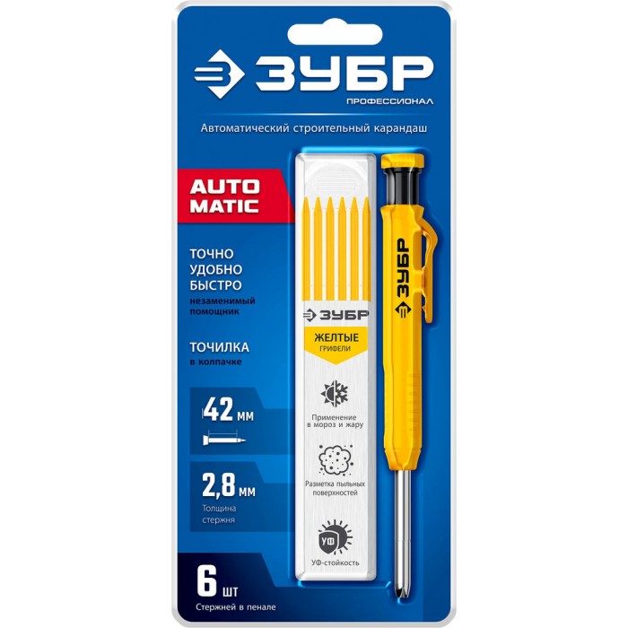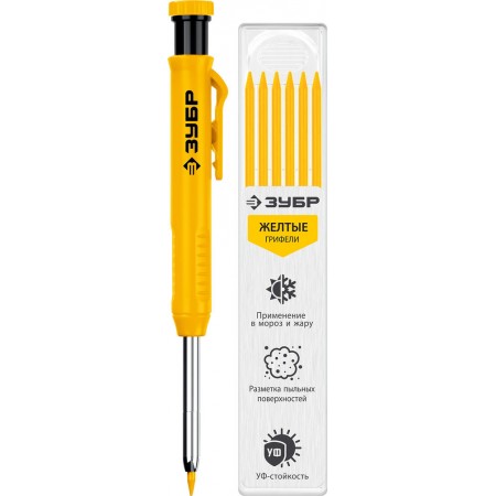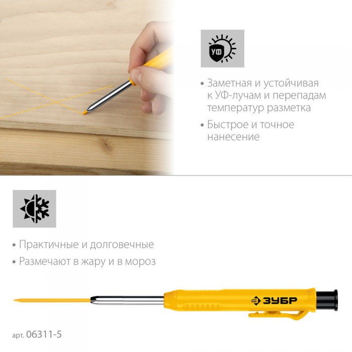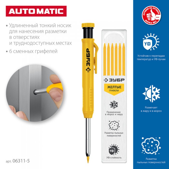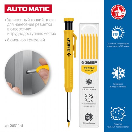 Автоматический строительный карандаш подходит для нанесения разметки на большинство материалов. Не выгорает на солнце, устойчив к температурным перепадам. Безопасен для человека и окружающей среды, т.к. не содержит токсических веществ.