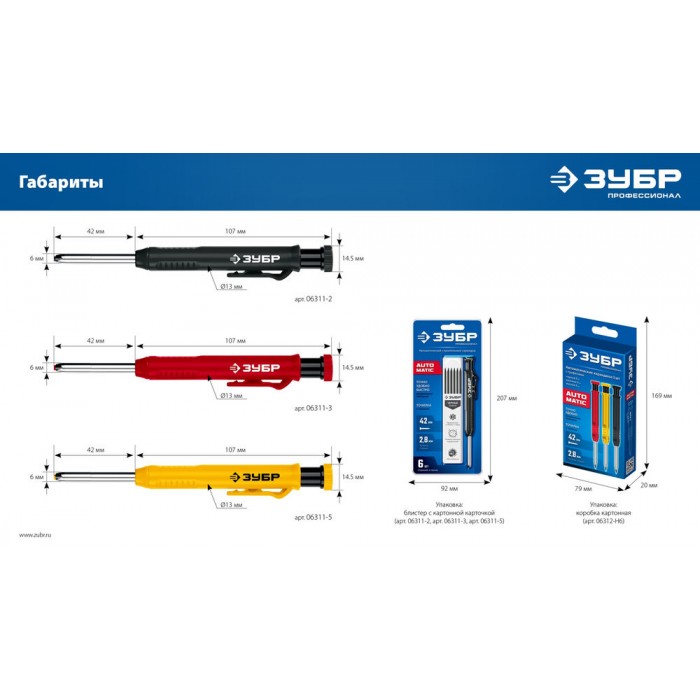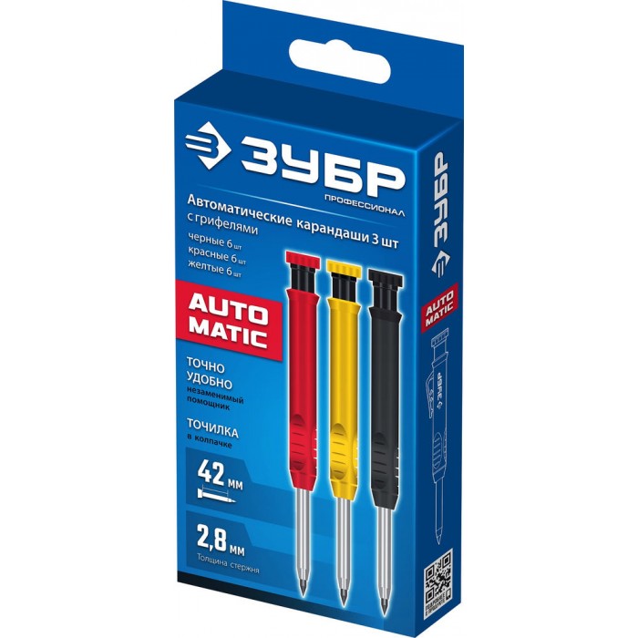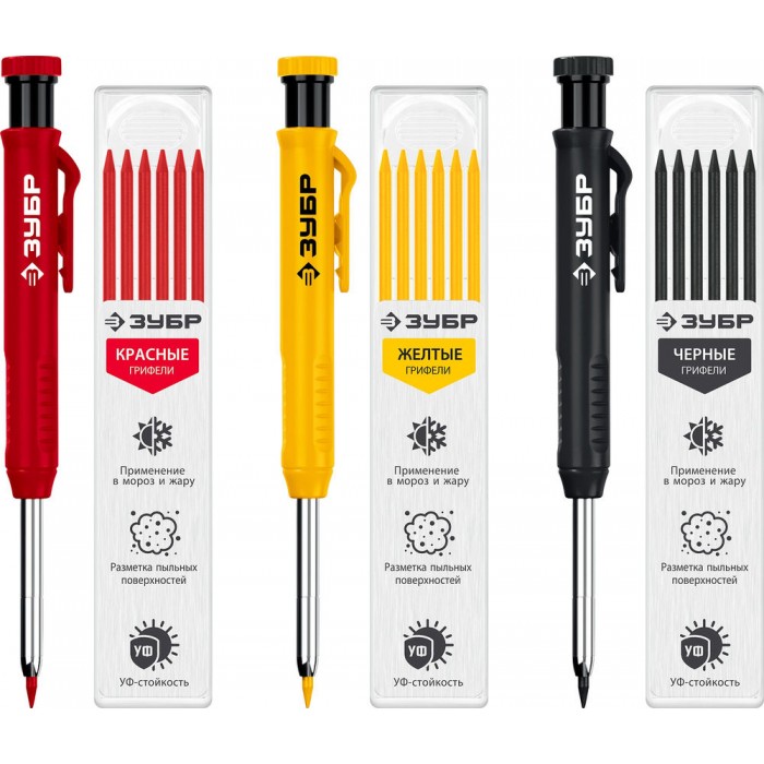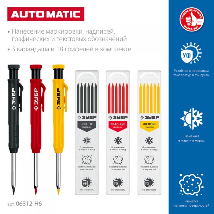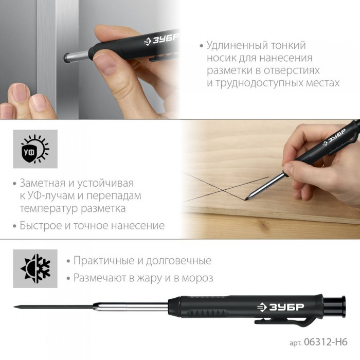 Автоматический строительный карандаш подходит для нанесения разметки на большинство материалов. Не выгорает на солнце, устойчив к температурным перепадам. Безопасен для человека и окружающей среды, т.к. не содержит токсических веществ.