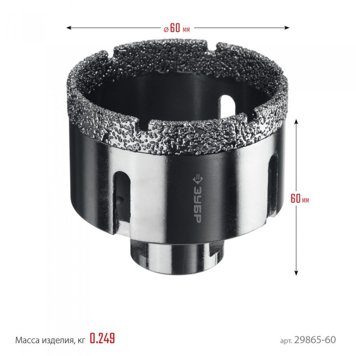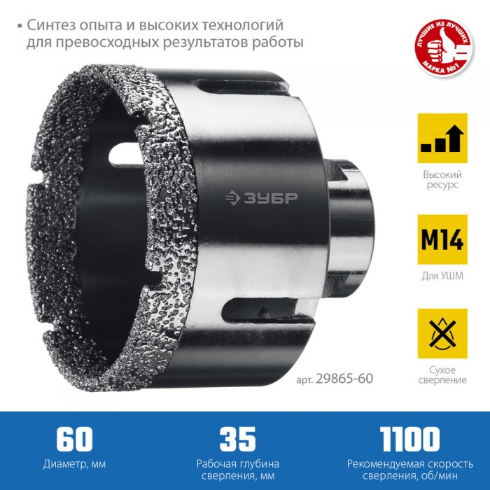 Коронка алмазная вакуумная АВК, d 60 мм, М14, 15 мм кромка ЗУБР Профессионал 29865-60