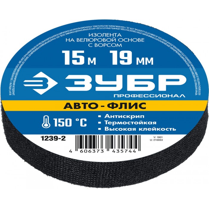 Изолента АВТО-ФЛИС, 19 мм x 15 м, черная, на велюровой основе с ворсом ЗУБР Профессионал 1239-2