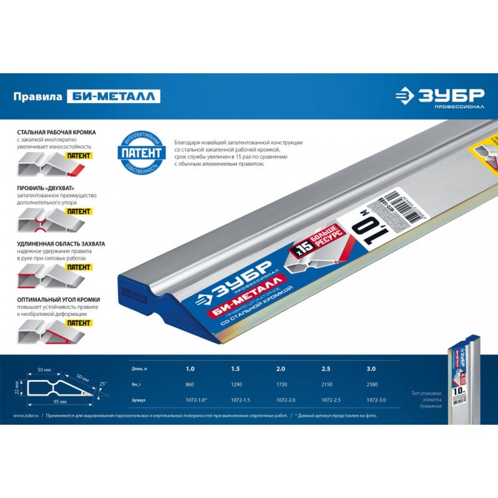 Благодаря новейшей запатентованной конструкции со стальной закаленной рабочей кромкой, срок службы увеличен в 15 раз по сравнению с обычным алюминиевым правилом