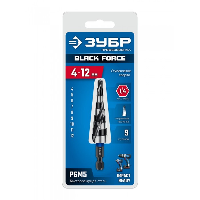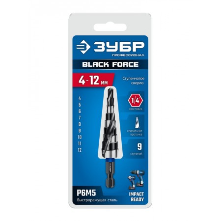 Сверло ступенчатое BLACK FORCE 4-12 мм, 9 ступеней, винтовая проточка ЗУБР Профессионал 29671-4-12-9