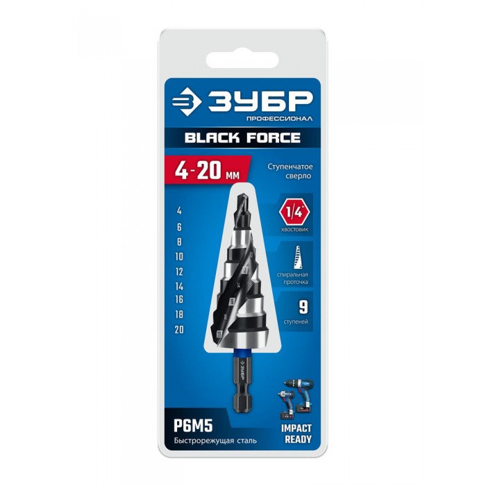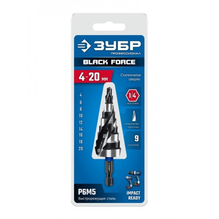 Сверло ступенчатое BLACK FORCE 4-20 мм, 9 ступеней, винтовая проточка ЗУБР Профессионал 29671-4-20-9
