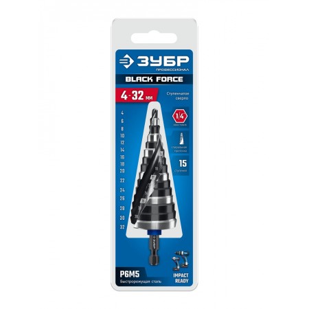 Сверло ступенчатое BLACK FORCE 4-32 мм, 15 ступеней, винтовая проточка ЗУБР Профессионал 29671-4-32-15