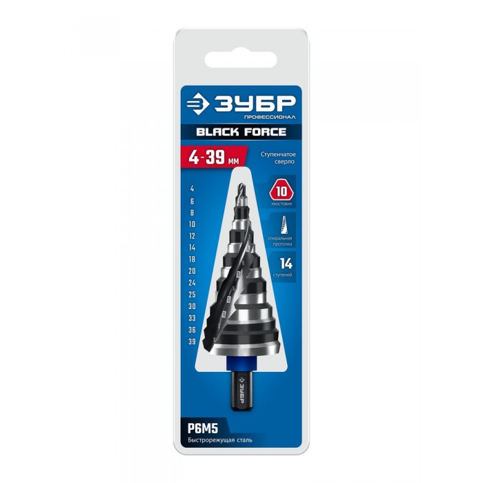 Сверло ступенчатое BLACK FORCE 4-39 мм, 14 ступеней, винтовая проточка ЗУБР Профессионал 29671-4-39-14