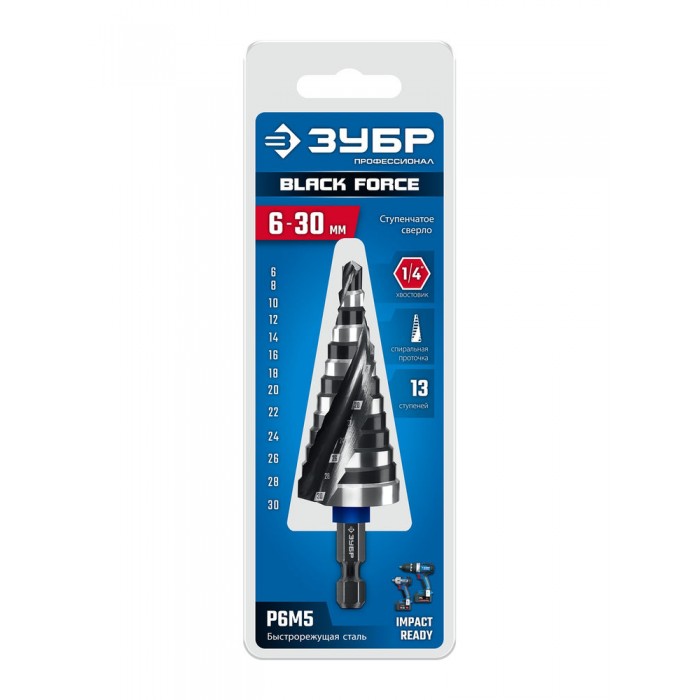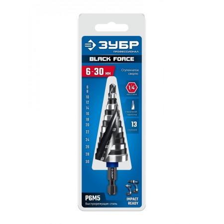 Сверло ступенчатое BLACK FORCE 6-30 мм, 13 ступеней, винтовая проточка ЗУБР Профессионал 29671-6-30-13