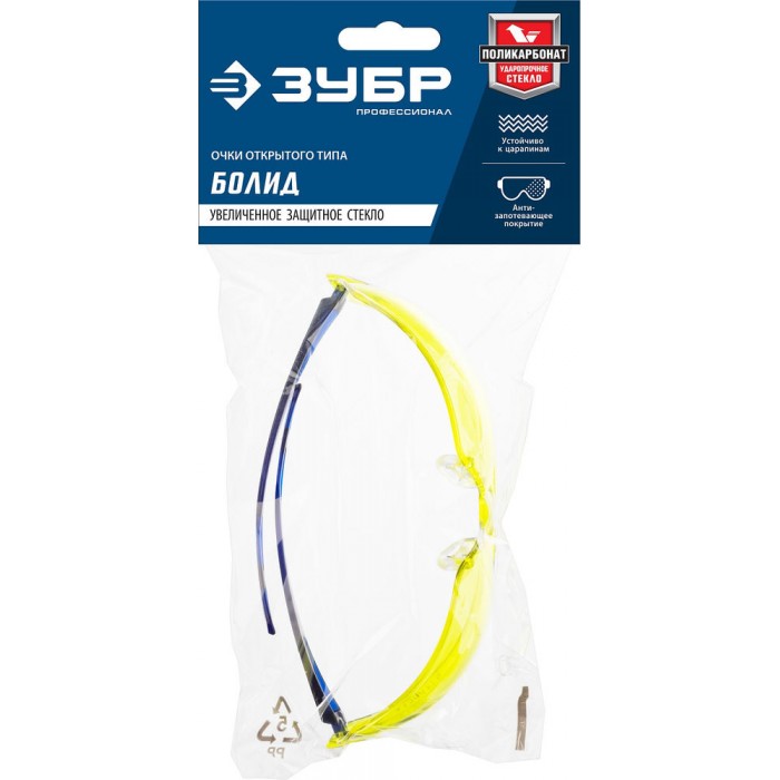 Очки защитные открытого типа жёлтые сферические стёкла устойчивые к запотеванию ЗУБР БОЛИД Профессионал 110486