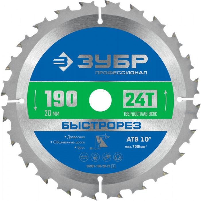 Диск пильный по дереву 190 x 20 мм, 24T ЗУБР Быстрорез Профессионал 36901-190-20-24_z01