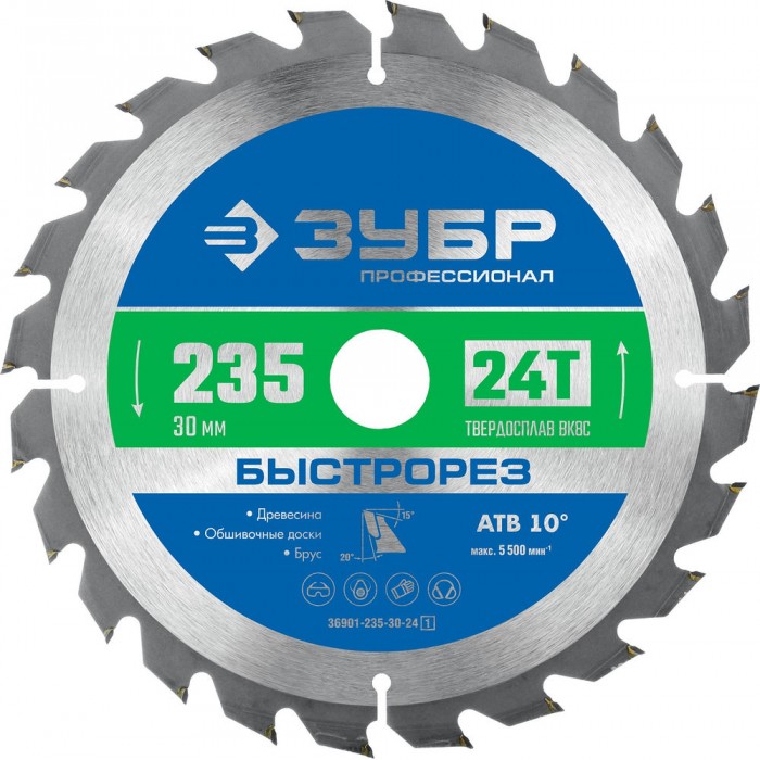 Диск пильный по дереву 235 x 30 мм, 24T ЗУБР Быстрорез Профессионал 36901-235-30-24_z01