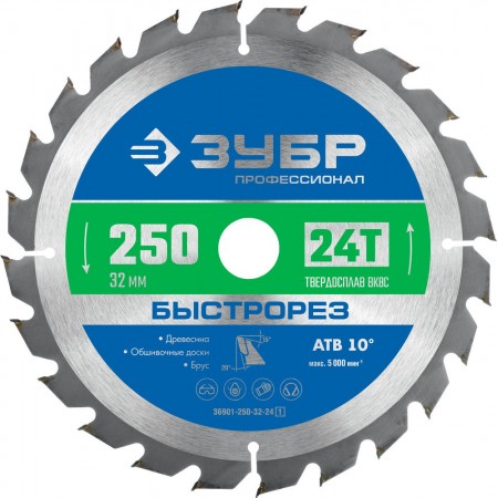 Диск пильный по дереву 250 x 32 мм, 24T ЗУБР Быстрорез Профессионал 36901-250-32-24_z01