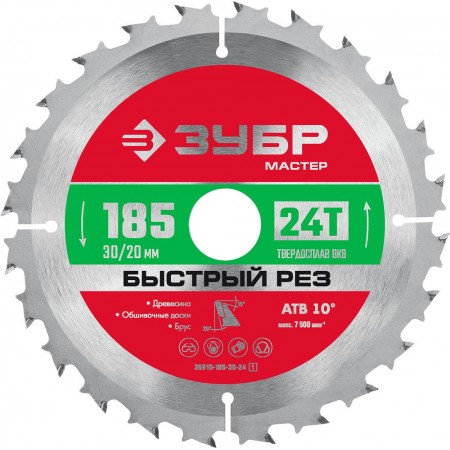 Диск пильный по дереву 185 x 30 мм, 24T ЗУБР Быстрый рез 36910-185-30-24_z01
