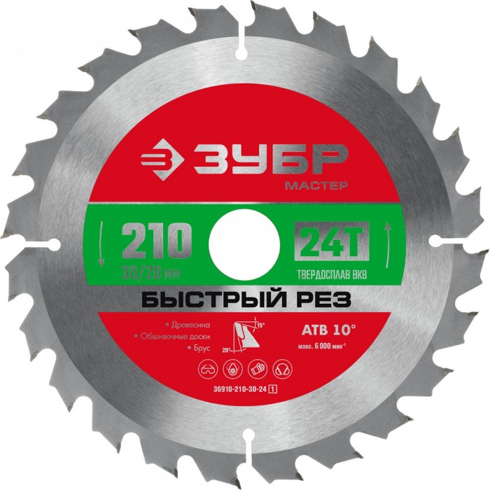 Диск пильный по дереву 210 x 30/20 мм, 24T ЗУБР Быстрый рез 36910-210-30-24_z01