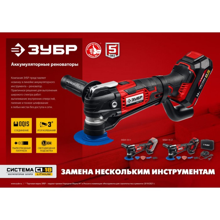 Реноватор аккумуляторный ЗУБР - универсальное устройство для разных строительных работ (резка, шлифование), особенно в труднодоступных местах и в отсутствие доступа к электричеству. Большой угол колебаний 3 градуса в сочетании с широким спектром регулировки частоты обеспечивают эффективную работу с любым материалом. Расширенная комплектация включает в себя базовый набор насадок для начала работы сразу после покупки