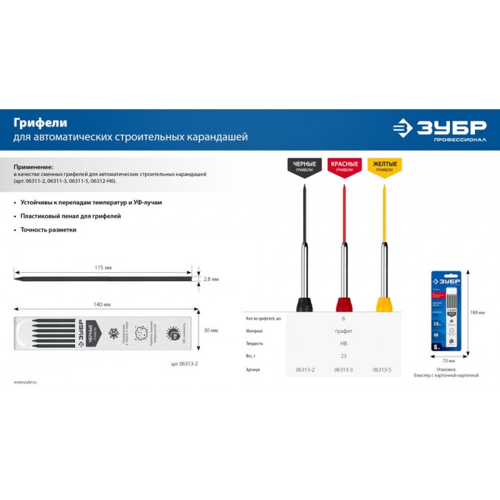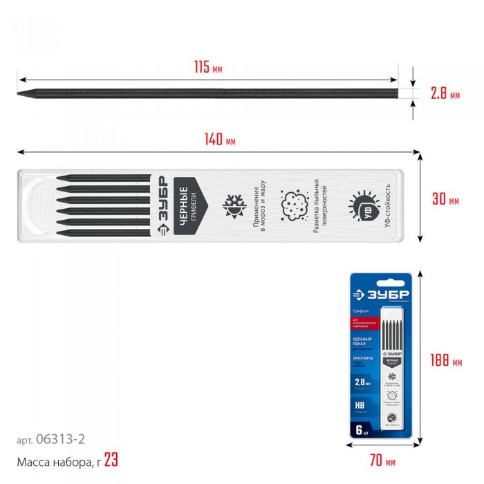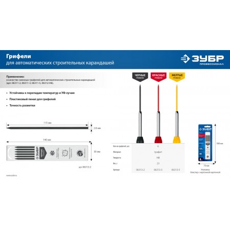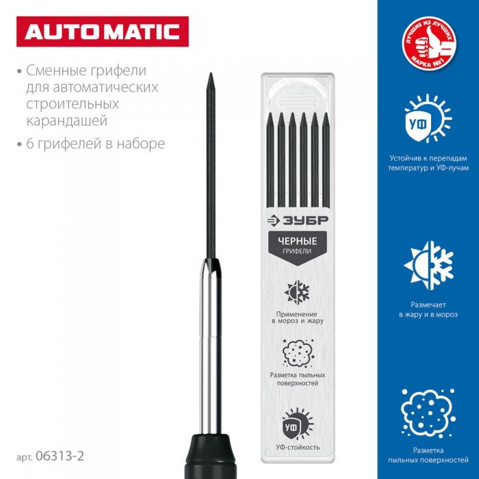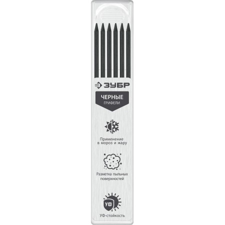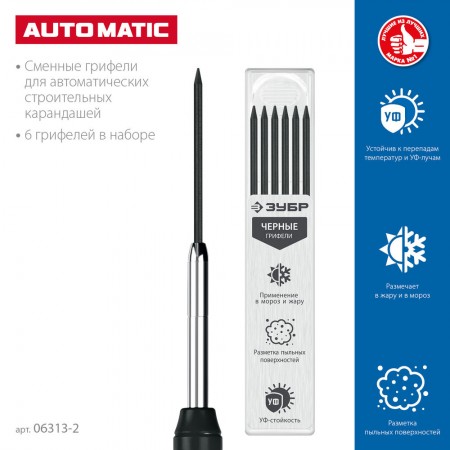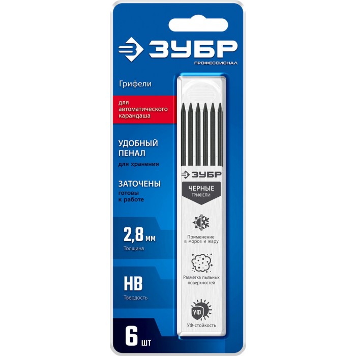 Грифели для автоматического карандаша черные 2.8 мм, HB, 6 шт ЗУБР 06313-2