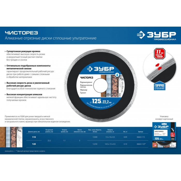 Алмазный диск сплошной Чисторез 125 мм (22.2 мм, 5 x 1.1 мм) ЗУБР Профессионал 36663-125