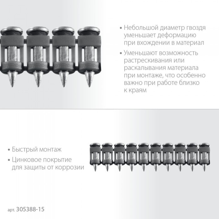 • Быстрый монтаж: гвоздь забивается при помощи гвоздезабивного пистолета (нейлера).