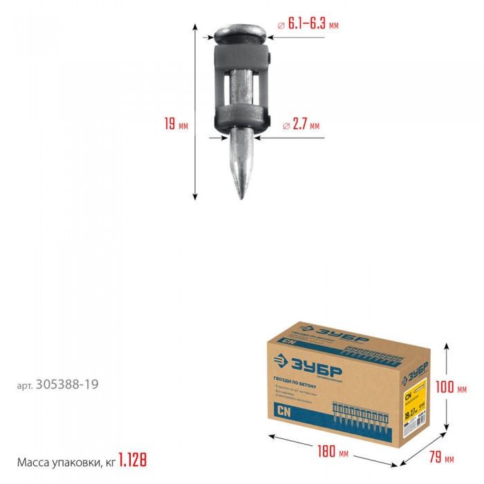 Гвозди по бетону CN 19 x 2.7 мм, оцинкованные, 1000 шт ЗУБР 305388-19