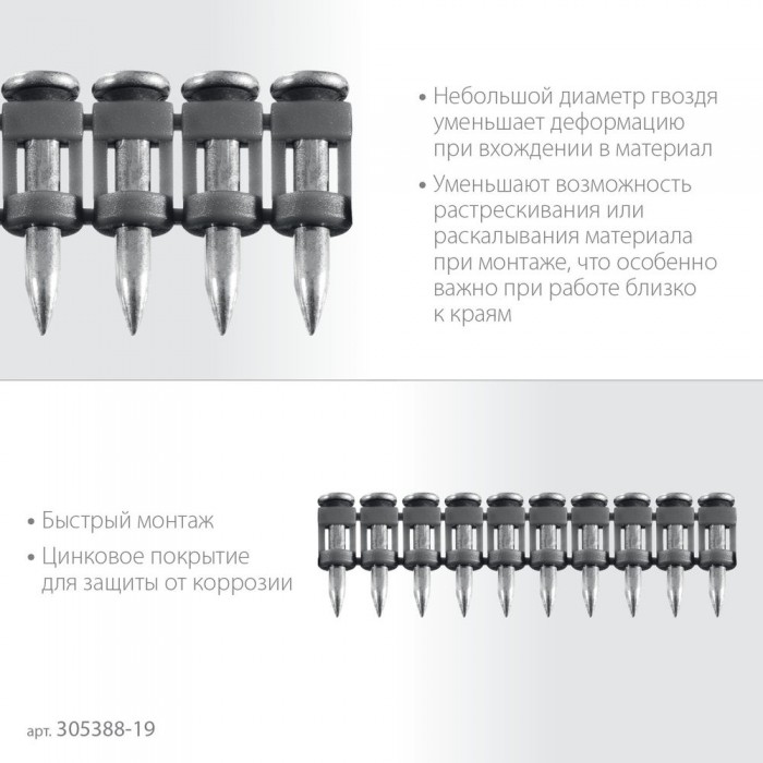 • Быстрый монтаж: гвоздь забивается при помощи гвоздезабивного пистолета (нейлера).