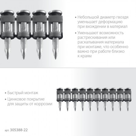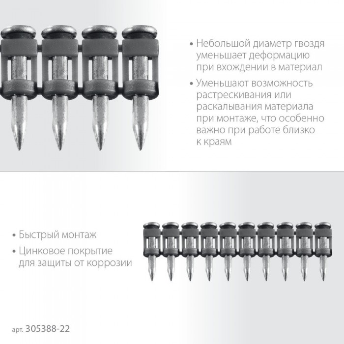 Гвозди по бетону соединены в кассету и забиваются при помощи газового или пневматического гвоздезабивного пистолета (нейлера). Необходимый размер гвоздя подбирается в зависимости от монтируемых материалов.