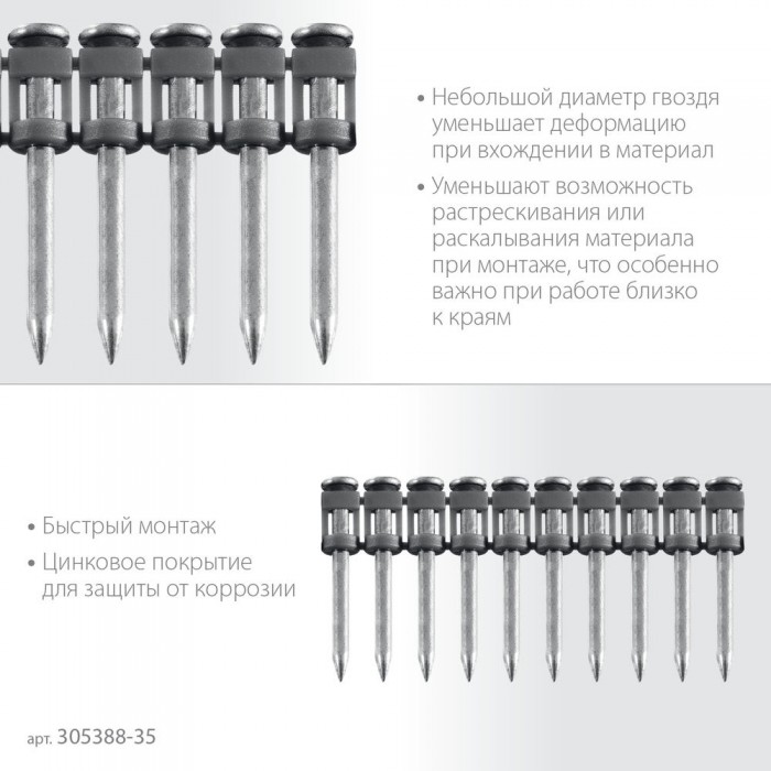 • Быстрый монтаж: гвоздь забивается при помощи гвоздезабивного пистолета (нейлера).