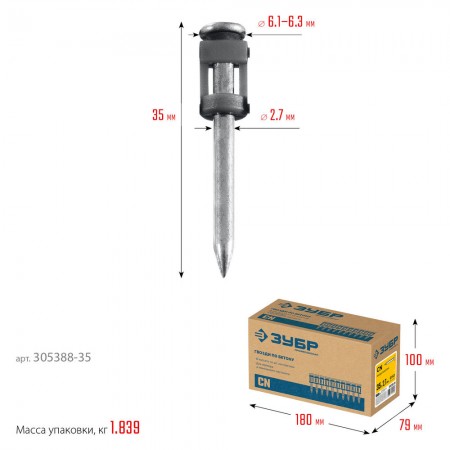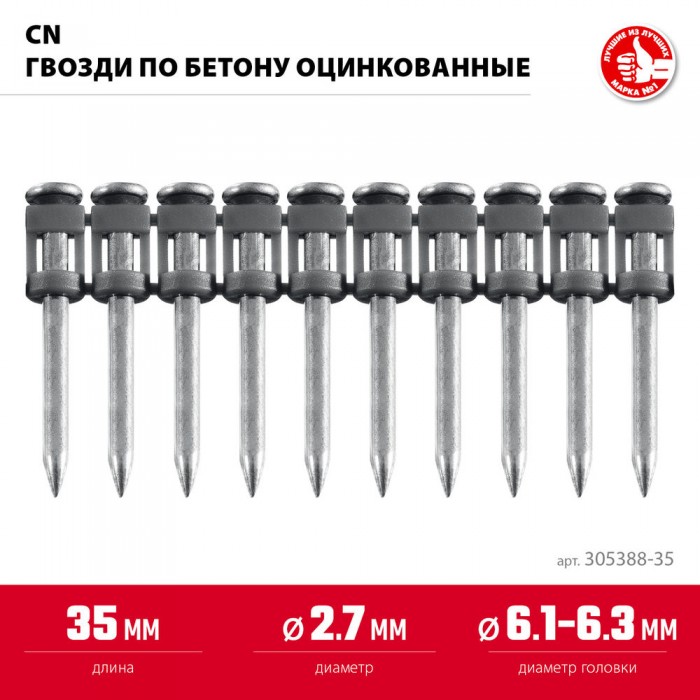 Гвозди по бетону CN 35 x 2.7 мм, оцинкованные, 1000 шт ЗУБР 305388-35